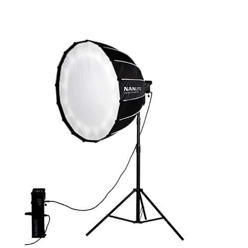 Nanlite Parabolic softbox 90 Quick-Open Softbox with Bowens Mount (35in). A 16-Sided Softbox with a deep parabolic design that creates even lighting with a wrap-around quality and natural-looking catchlights while increasing directional control. Includes 1-Stop Front Diffuser, 2-Stop Front Diffuser, Bowens Mount Quick-Open Speedring and Carry Bag.